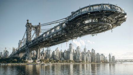 Futuristic science fiction cityscape with massive floating circular structure hovering above urban skyline and river.
