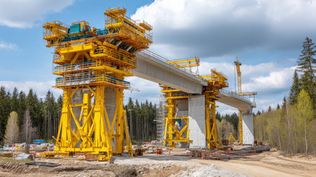 A detailed view of an elevated railway bridge under construction featuring vibrant yellow machinery, surrounded by trees and a clear blue sky.