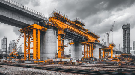 A striking view of an industrial construction site featuring large orange cranes and sturdy concrete pillars, set against a dramatic cloudy sky, reflecting development and engineering.