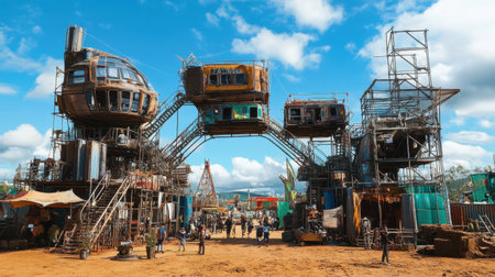 Vibrant outdoor festival area showcasing unique architectural structures and innovative art installations, inviting attendees to explore creativity and community spirit.