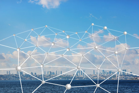 Abstract human connection on the beautiful modern city and seafront background.