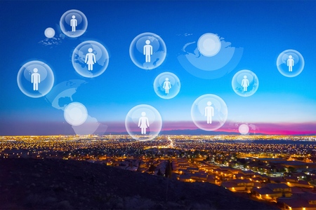 Interconnected figures on a digital landscape symbolizing social networks and business connections
