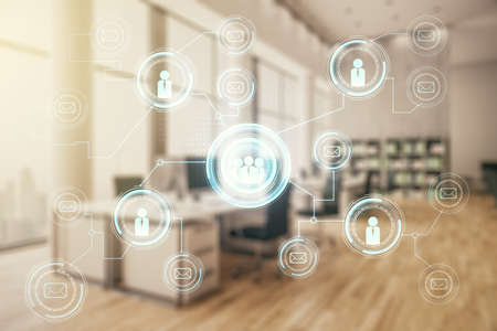 Abstract virtual social network concept on a modern furnished office background. Multiexposure