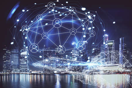 Glowing Social media icons on night panoramic city view of Singapore, Asia. The concept of networking and establishing new connections between people in businesses. Double exposure.