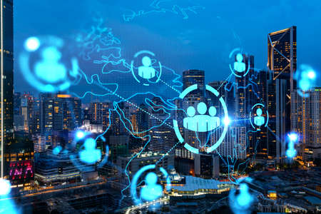 Hologram of social media icons over sunset panoramic cityscape of Bangkok, Southeast Asia. The concept of people connections and career opportunities. Multi exposure.
