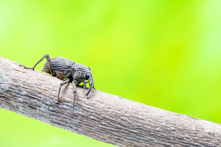 Close up of a weevil on a wooden stick in the forest