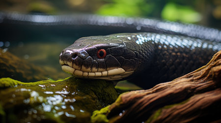 close-up of a large snake emerging from the water, its head reflecting on the surface. The intricate scales and intense gaze create a powerful and mysterious atmosphere in a lush, natural environment. High quality photo