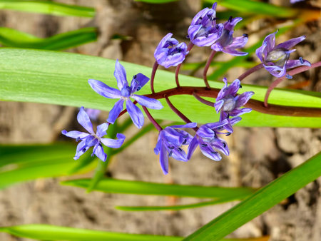 Close-up of Blue flowers of Siberian squill or wood squill or Scilla siberica growing up on a sunny spring day.