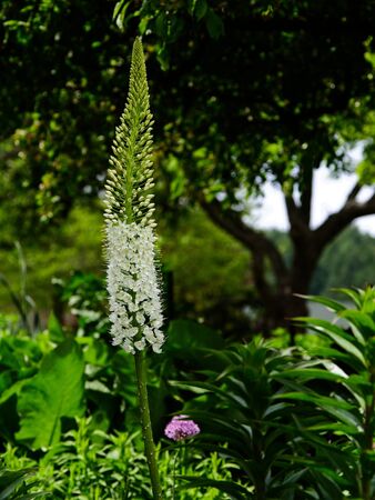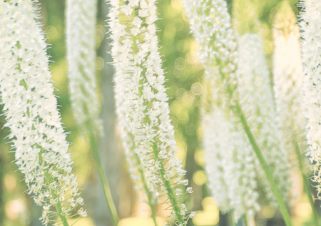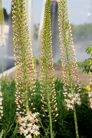 Bright white inflorescences of Eremurus in the summer garden, Greece.