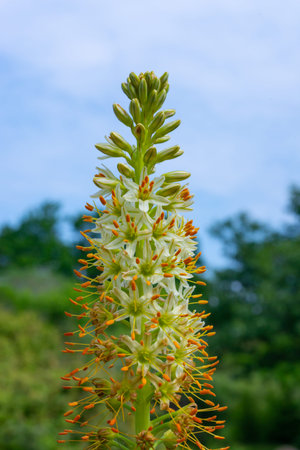 Inflorescence of an ornamental plant Eremurus with yellow stamens and a pleasant aroma in the garden, Ukraine