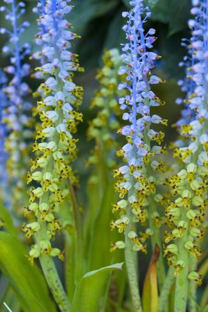 Tender flower of drimiopsis on sunny foliage bokeh background