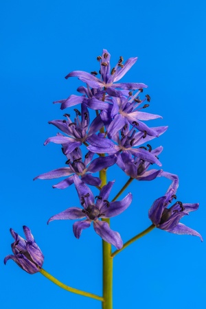 detailed macro close up of blue squill (scilla) flowers with yellow pistils