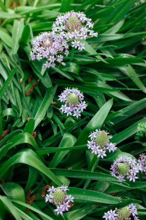 Portuguese Squill Beautiful peruvian lily (scilla peruviana) flower in spring garden Purple bulbous plant in bloom on green natural background.