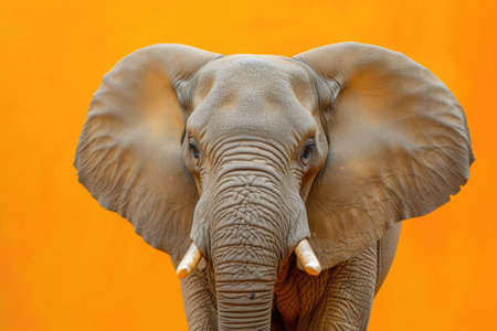 Close up of a majestic African elephant with prominent ears and tusks against a vibrant orange background, highlighting wildlife and nature