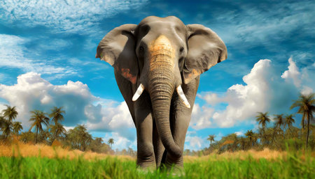 Front and bottom view of a wild Indian elephant walking and looking at camera, on green grass field near the forest, blue sky with clouds in the background. Generative Ai.
