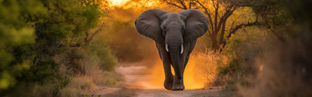 A powerful elephant walks through a forest path, surrounded by golden sunset and dust clouds