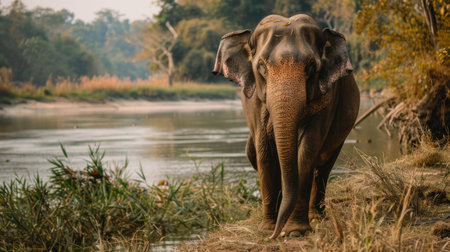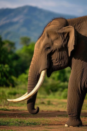 A close-up view of a majestic African elephant standing gracefully in its natural habitat. The scene captures the beauty and tranquility of wildlife in the wild.