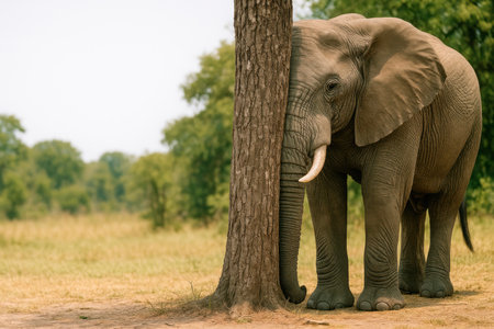 An elephant hides behind a tree in the savannah