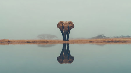 Majestically standing on the shore of a calm lake at sunrise, an elephants reflection perfectly mirrors in the still water, creating a breathtaking scene of tranquility