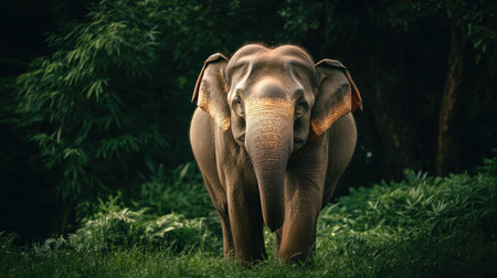 A stunning portrait of an elephant standing gracefully in a lush green forest. The scene captures the beauty of this gentle giant in its natural habitat, embodying the essence of wildlife.