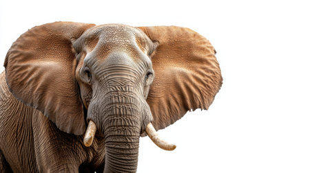 A large elephant with a wrinkled face and tusks stands in front of a white background