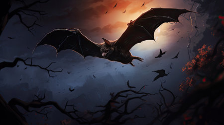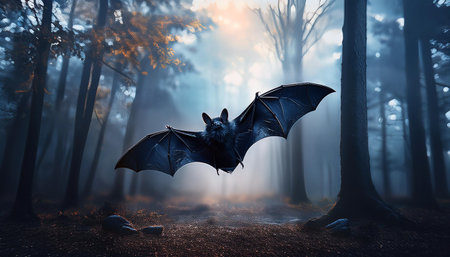 Mysterious bat gracefully flies through a dark forest at twilight, creating a spooky atmosphere