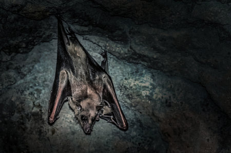 Bat hanging from a ceiling in cave. Halloween concept. 3D Rendering