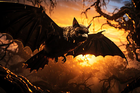 a bat gracefully soars through the autumn sun, casting a striking silhouette against a majestic tree. this realistic yet fantastical image showcases photobashing techniques and softbox lighting, resulting in a captivating portrayal of the bat. the composition captures the essence of dynamic storytelling, while the warm hues of light bronze and orange add to the breathtaking beauty of this scene. ai generated