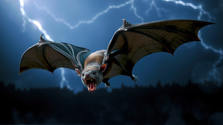 A bat flies through a stormy sky with its fangs bared, surrounded by lightning strikes