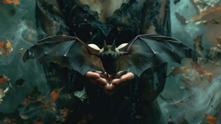 Gothic Hands Holding Bat in Mysterious Smoky Atmosphere Among Falling Leaves