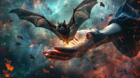 Mysterious Bat Emerging from Hands in Ethereal Smoky Atmosphere with Fiery Sparks and Leaves