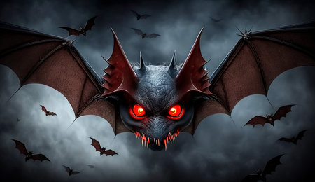 Terrifying bat flies through the dark forest at night, its wings outstretched, eyes glowing red and sharp teeth gleaming in the moonlight, embodying horror and danger, perfect for Halloween