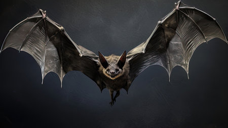 Bat with spread wings in mid-flight against dark background