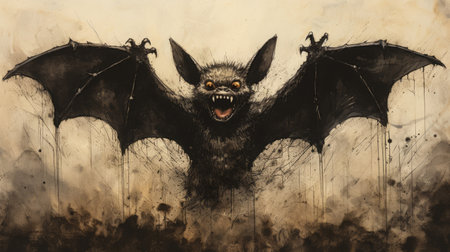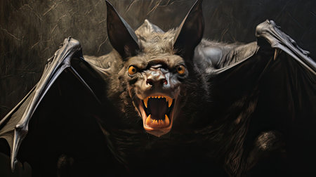 This close-up image captures a bat showing its sharp teeth in an intense expression. The detailed portrayal highlights this nocturnal creature's fierce and eerie features.
