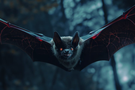 Close-up of a bat flying at night, mysterious forest background. Nocturnal wildlife and nature concept