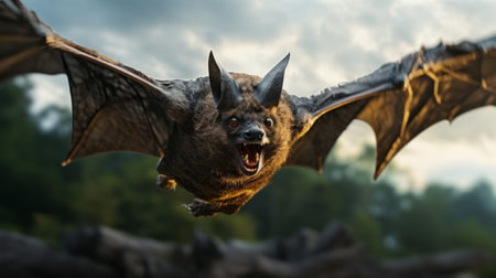 a bat soaring through the sky, captured in a stunning vray tracing style. the image showcases a powerful facial expression and intricate hunting scenes. with explosive pigmentation and the use of tilt-shift photography, this photo evokes a sense of mythological references, reminiscent of the legendary creature, the manticore. ai generated