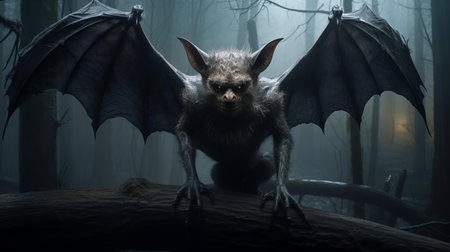 a realistic and detailed rendering of a bat flying in the dark forest, reminiscent of primordial creatures. this captivating image, created in cinema4d, showcases the artistic styles of boris vallejo, bill gekas, manticore, and aries moross. ai generated