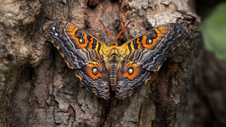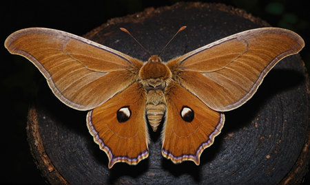 A large brown and orange Polyphemus moth peacefully resting on a tree in a dramatic setting.