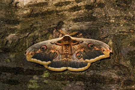 Great Peacock (Saturnia pyri) beautiful insect in the nature habitat. Big butterfly sitting on the tree. Animal in the wood. Summer scene from Czech republic.