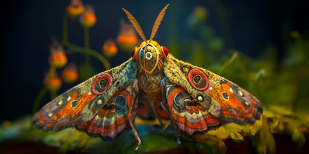 A moth with vibrant colors and intricate wing designs Sitting on moss with water drops Inspired by the Celtic god Cernunnos Filigree wing design adds a touch of elegance to the overall aesthetic
