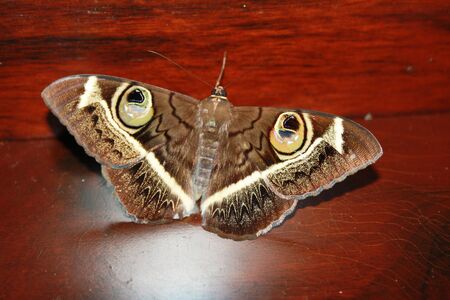 A brown moth with white eyespots rests on a piece of wood