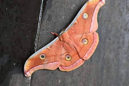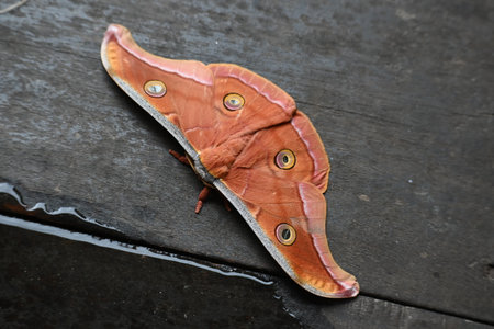 Eri silkmoths (Samia ricini), with open wings, on wooden surface