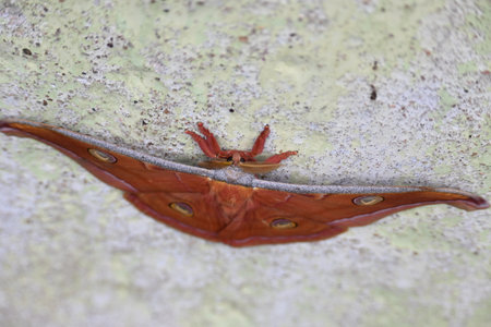 A vibrant Atlas moth butterfly the largest moth species in the world, showcases its elaborate wing patterns, with distinctive eye-like markings and orange-brown hues, as it rests peacefully among the foliage of a garden.