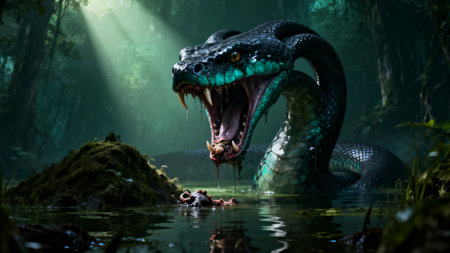 close-up of a large snake emerging from the water, its head reflecting on the surface. The intricate scales and intense gaze create a powerful and mysterious atmosphere in a lush, natural environment. High quality photo