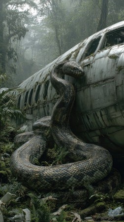 A massive snake wraps around a damaged airplane fuselage in a lush, overgrown forest. The scene features a muted color palette with dominant greens and browns. The composition is dramatic, with an emphasis on texture and detail. This image could be used for various editorial or commercial purposes related to nature, survival, and adventure.