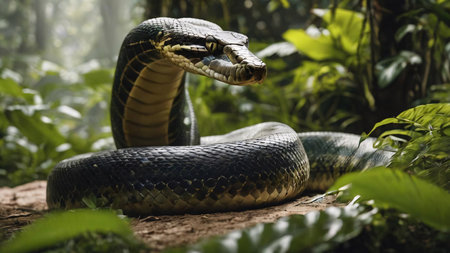 snake, poised with its body coiled, as it lies in wait for a passing prey, showcasing the predator's lightning-fast strike and precise capture.Generative AI