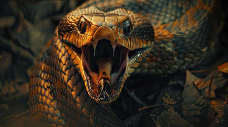 Brown forest cobra with open mouth. A highly venomous species showing warning behavior. AI Generated.