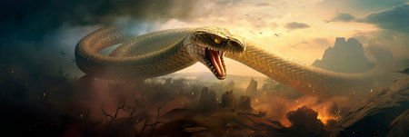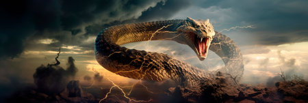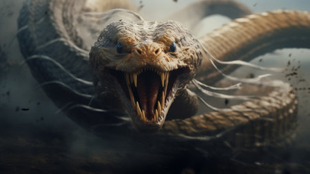 a snake with a large mouth is depicted in this action-packed scene, standing in the middle of the ground. the artwork is created in the style of matte painting, with layered fibers and intricate detailing. the snake's strong facial expression adds to the intensity of the image. this piece of art is reminiscent of the work of rob liefeld and aquirax uno. ai generated