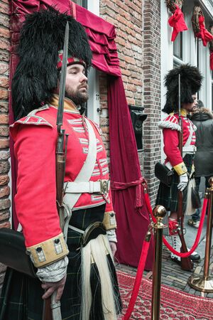Deventer, Netherlands, December 15, 2018: Two Scottish Highlanders in traditional clothing on guard at a door during the Dickens Festival in Deventer