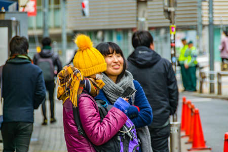 TOKYO, JAPAN, JANUARY - 2019 - Two women standing at sidewalk, shibuya district, tokyo, japan